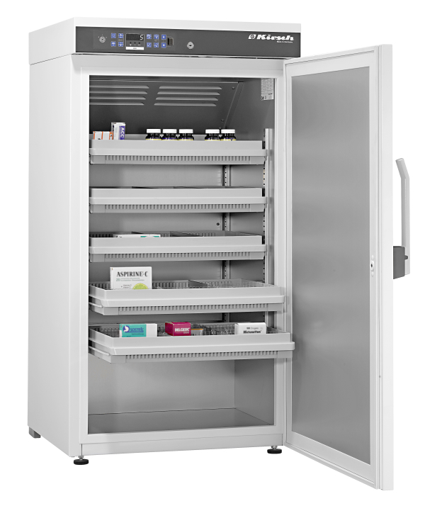 В стандартном оснащении фармацевтического холодильника пять регулируемых по вертикали ящиков из пластика. Ящики опираются на телескопические направляющие и имеют фиксирующий элемент. В каждом ящике есть 2 регулируемых перегородки по длине и 9 регулируемых поперечных перегородок.